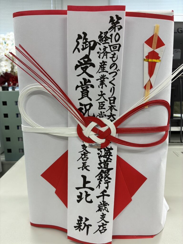 経済産業大臣の赤澤亮正氏から直接、表彰状を手渡していただきました。高市早苗首相からもお言葉をいただき、北海道千歳市の小さなメーカーとしては、夢のような一日でした。