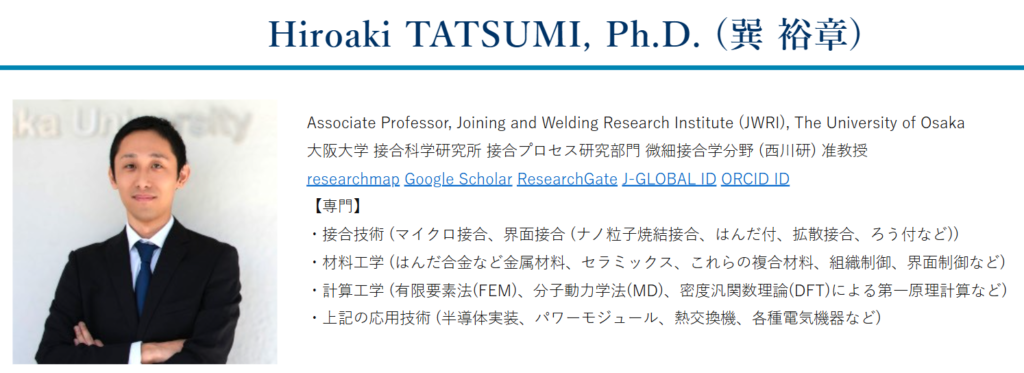 今回の受賞論文の筆頭著者は、大阪大学接合科学研究所 微細接合学分野の巽裕章先生です。