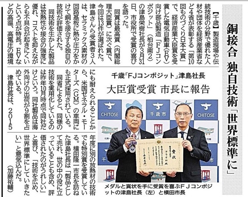 先日3月26日に、第10回ものづくり日本大賞にて経済産業大臣賞を受賞したことは、前回のトピックスでお知らせしたとおりです。この度、3月31日に千歳市役所を訪問し、横田隆一市長へ直接ご報告させていただきました。